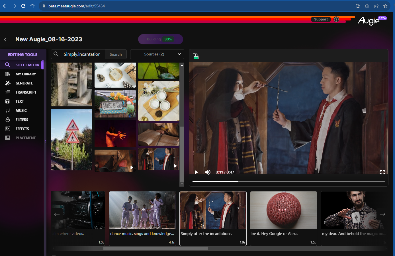 Intrigued, I created a free account at https://beta.meetaugie.com/ and generated a video based on a prompt suggesting that we are living in a world of magic, where you can get music, videos, and information, just by uttering the magic words, "Hey Google" or "Alexa". The platform then created a script for me based on that prompt, asked me to choose a voice (or record my own), then generated a video in less than a minute. I was then able to open my "Augie" in an editor which allowed to edit each panel, replacing the stock images or videos it chose with whatever else I wanted, assuming I didn't like what it picked. I've included an image of the editor window below.