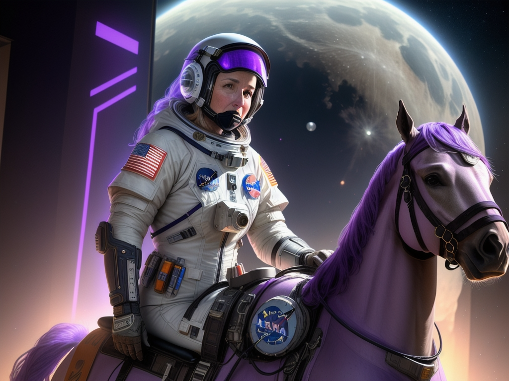 But what if you wanted an 80-year-old female astronaut in an old NASA suit, her face clearly visible behind the faceplate, riding a purple horse with a kind of futuristic armor that generates oxygen and protects his body (never mind that the astronaut is wearing a suit), with a high-rise Moon base in the distance.