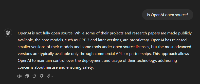 There are, however, a few truly open source AI projects in the classical free and open-source software (FOSS) sense. Mistral AI is one of the notable examples, whose Mistral 7B and Mixtral 8x22B, are released under the Apache 2.0 license, which is a permissive open-source license that allows for free use, modification, and distribution, even for commercial purposes. I mentioned that Grok uses the Apache 2.0 license, but unlike Grok, Mistral includes all source code including that which is necessary to build and train the model.