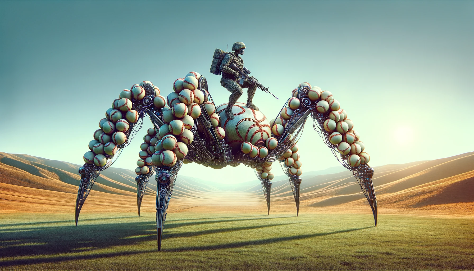 I asked for "Landscape image of a soldier made from baseballs, riding on a mechanical robotic spider," and got the following. Note that the spider, not the soldier, is made entirely from baseballs, but still cool.